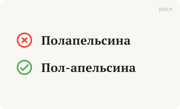 На новогоднем примере разбираемся со словами, которые начинаются на пол- и полу-: когда их следует писать слитно, когда нужен дефис, и что там с исключениями. Правильно: пол-апельсина Сначала сразу ответ на вопрос, заявленный в заголовке: пол-апельсина пишется через дефис, потому что вторая часть слова начинается с гласной. А теперь по порядку. Правило № 1: Слова, которые начинаются с полу-, всегда пишутся слитно: полумрак, полушарие, полукруг, полумифический. Кроме случаев, когда вторая часть слова содержит дефис: полу-автомат-укладчик, полу-пресс-центр, пол-яхт-клуба. Правило № 2 Сложные слова с пол- пишутся слитно, кроме трех случаев дефисного написания. Вот несколько слов для примера: полчаса, полкниги, полбатона, ползарплаты. Теперь постараемся запомнить случаи, когда нужно ставить дефис: Если вторая часть слова (после пол-) начинается с гласной буквы (вот они, наши пол-апельсина, а также пол-яблока, пол-утки и пол-ангара). Если вторая часть слова пишется с прописной буквы, вне за