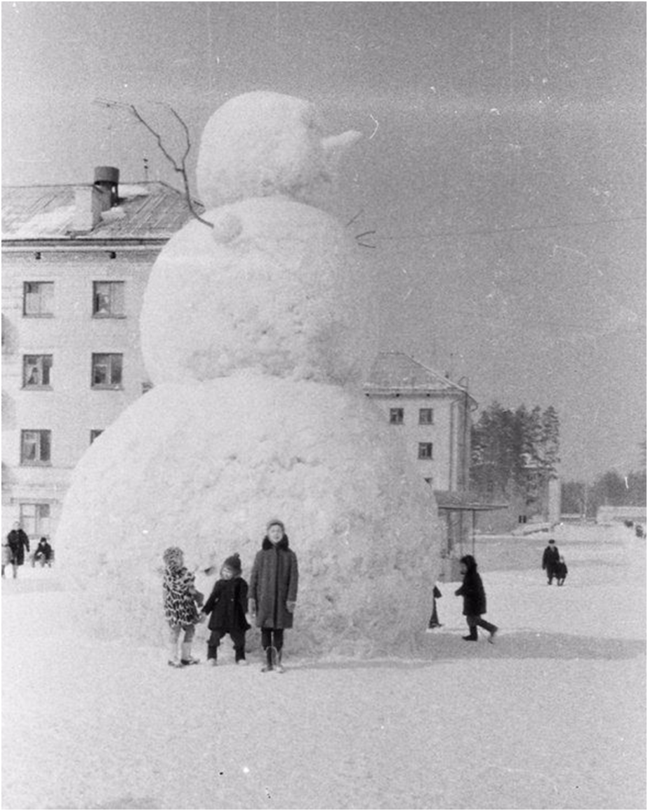 На фотографии, сделанной в 1960-ые годы, вы можете увидеть гигантского снеговика. Интересно, кто же такого слепил?!
