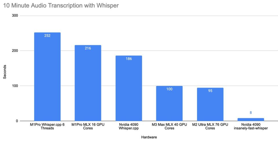 Apple недавно анонсировала платформу с открытым исходным кодом под названием MLX, которая специально разработана для чипсетов компании M-серии. Разработчики могут использовать эту платформу для проектирования, тестирования и улучшения своих проектов, что Оливер Веренс и сделал с различными компьютерами Mac вместе с графическим процессором RTX 4090 и предоставил результаты. Платформа MLX использует модель распознавания речи Whisper от OpenAI, и Веренс провел тест транскрипции, чтобы увидеть, насколько быстро работают различные чипы. Первоначальные результаты теста с 10-минутным аудиофайлом показывают, что M2 Ultra и M3 Max на удивление быстрее, чем настольная RTX 4090, но это также связано с тем, что для проведения теста был запущен неоптимизированный инструмент, как показано на графике. Веренс также предоставил результаты, используя оптимизированный инструмент, и результаты примерно такие, как и следовало ожидать - RTX 4090 оставляет позади как M2 Ultra, M3 Max, так и остальные SoC. По