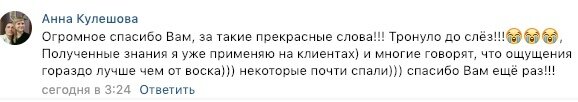 Вот такие отзывы оставляют наши ученицы, прошедшие курс по шугарингу "Глубокое бикини" всего за 1 день. Задать интересующие вопросы, узнать свободные даты обучения, а также записаться на курс можно здесь - https://makealady.ru/depilyatsiya/kurs-shugaringa-glubokoe-bikini/