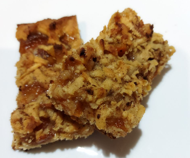 Мука нутовая – 1,5 стакана Мука пшеничная – 1,5 стакана Сметана 20% – 0,5 стакана Сахар – 3/4 стакана Масло сливочное – 100 грамм Арахисовая паста – 1 ст. ложки Куркума – ½ ч. ложки Специи – 1 ч. ложка (ванилин, корица) Соль – на кончике ножа Повидло – 3-4 ст.ложки Масло растительное – 2 ст. ложки Сода – 1 ч. ложка, лимонная кислота - 1/3 ч. ложки Сахарная пудра – 1-2 ч. ложки для посыпки. В муку добавить отруби, соду, лимонную кислоту, добавить размягченное сливочное масло, арахисовую пасту. Перемешать с мукой. Смешать сметану с сахаром, добавить специи, до растворения сахара. Добавить сметану с сахаром к натертому сливочному маслу, замесить тесто. Оду четвертую теста убрать в морозильную камеру. Основную часть теста положить в холодильник на 20-30 минут (можно на ночь). Тесто раскатать в коржи средней толщины (0,5-0,7 см), края немного защипать (в виде небольшого бортика), выкладываем на противень присыпанный мукой, выкладываем тонким слоем повидло, разравниваем лопаточкой, замороже