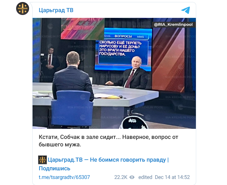 Вопрос о дальнейшей судьбе Ксении Собчак на экран в зале пресс-конференции президента попадал дважды.