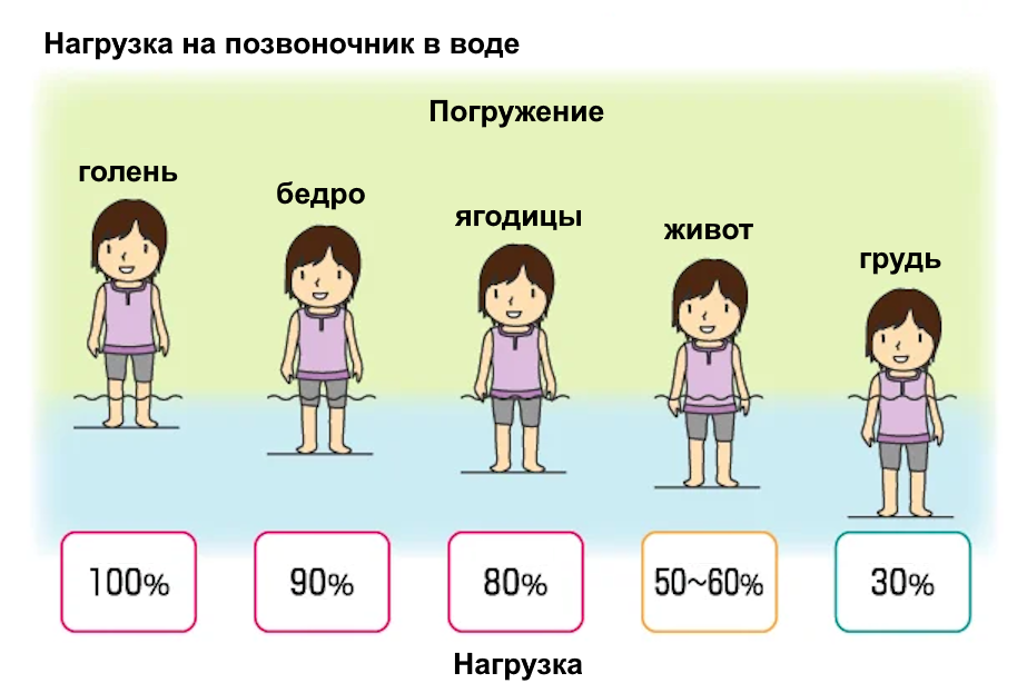 При болях в пояснице рекомендуется водная ходьба, например, в бассейне. Упражнения в воде требуют больше усилий, чем на суше, т.к. вода гораздо плотнее воздуха. При этом нагрузка на позвоночник минимальна, таким образом риск спровоцировать усиление болей в пояснице меньше. Каковы преимущества ходьбы в воде? Во время пребывания в воде снижается нагрузка на позвоночник и суставы. Так, при погружении в воду по грудь нагрузку будет составлять 30% от веса. Находясь в воде, можно тренировать чувство равновесия и укреплять основные группы мышц. Считается, что тренировка в воде позволяет сжечь столько же калорий, сколько сжигается при выполнении 2/3 упражнений на суше. Дополнительное сопротивление в воде позволяет лучше укрепить мышцы. При ходьбе в воде улучшается кровообращение. Благодаря этому повышается тонус мышц ног, улучшается координация движений. Благодаря выполнению упражнений в воде повышается сила дыхательных мышц и укрепляется дыхательная система. Нельзя забывать: Если Вы страдаете