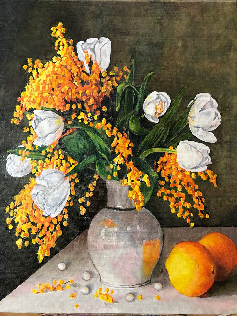 Мир цветов - моя утеха, Я пишу цветы повсюду На холсте и на бумаге, На салфетке возле блюда. Снежно белые тюльпаны В обрамлении мимозы, Россыпь розовых жемчужин, Что искрятся будто слёзы. И с полотен свет струится, Согревая, окрыляя, Разрывая плен темницы, На свободу опуская.