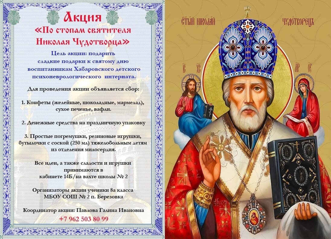 Ученики школы № 2 поселка Березовка по традиции поздравят воспитанников психоневрологического интерната с днем памяти святителя Николая Чудотворца, одного из самых почитаемых в России святых. Акция «По стопам святителя Николая Чудотворца», приуроченная ко дню его памяти, проходит в школе уже не первый год. Ее инициировала учитель русского языка и литературы, преподаватель ОПК, а также прихожанка храма святой блаженной Матроны Московской поселка Березовка Галина Павлова. Сами школьники с удовольствием проводят акцию. Некоторые ребята уже окончили школу и передали эстафету младшим друзьям. По словам Галины Павловой, каждый год акция расширяет свои границы. — Два года назад к ней присоединился краевой центр образования, они собирают подарки подопечным Дома престарелых и инвалидов в селе Черняево. Также ученики школы №51 собирают подарки детям Донбасса в рамках нашей акции, а в этом году к нам решили присоединиться школьники села Князе-Волконское, — сказала Галина Ивановна. — В этом году м