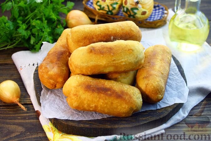 Жареные пирожки с печенью и картофелем. Жареные пирожки удлиненной формы были популярны в прежние времена. Компактная продолговатая форма пирожков позволяла брать их с собой – пирожки не сминались и сохраняли аппетитный вид. Тесто для пирожков замешивается на кефире, без дрожжей. Внутри – много вкусной начинки из отварного картофеля и обжаренной печени с луком.