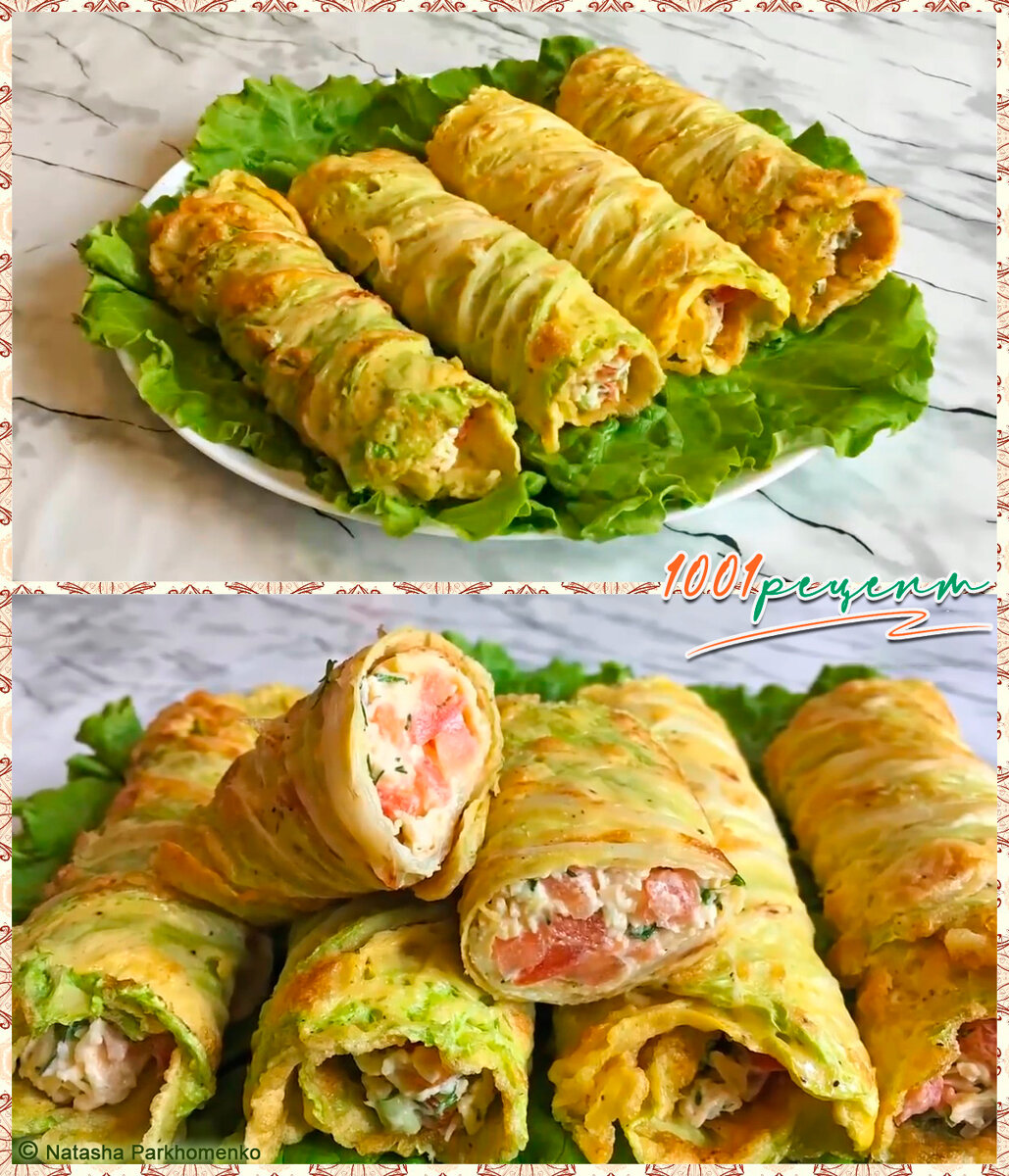 Из указанных ингредиентов получается 10 шт. Ингредиенты 🔸10 листиков пекинской капусты 🔸4-5 яиц 🔸50-60 г. муки 🔸соль, перец черный молотый по вкусу 🔸растительное масло для жарки 🔸листья салата для подачи Начинка: 🔸2 помидора 🔸200 г. сыра 🔸свежая зелень (укроп, петрушка, зеленый лук) 🔸соль, перец черный молотый по вкусу 🔸майонез Как приготовить Для начала подготовим листья капусты. У листа надо отрезать загрубевшую часть, а оставшуюся серединку с прожилками слегка отбиваем молоточком. Приготовим кляр. В яйца добавляем соль, перец черный молотый и все слегка взбиваем венчиком. Сюда же добавляем муку и все взбиваем венчиком в однородную массу. В сковороду наливаем немного растительного масла , разогреваем его. Каждый подготовленный листик капусты хорошенько обмакиваем в кляр и обжариваем с двух сторон до ле