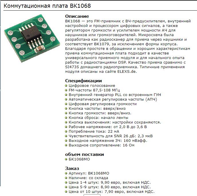 Добрый день дорогие друзья. Сегодня мы продолжим наш разговор начатый на моем канале в публикации: BK1068 – малоизвестная, но очень простая и интересная для радиолюбителей микросхема DSP FM радио» и завершением этого разговора будет сборка очень простого громкоговорящего радиоприемника на одной микросхеме BK1068. Я очень рекомендую Вам ознакомиться с выше указано статьей , чтобы что бы Вы были в теме, о том о чем сегодня будем говорить. На просторах российского Интернета, я не встречал практически никакой информации об этой микросхеме, а тем более схемы и описания работающего радиоприемника микросхеме BK1068, но зато много информации я нашел на немецких сайтах и форумах. Немцам эта микросхема очень нравиться, и они даже разработали DIP модуль с 8 выводами, и все свои конструкции они собирают в основном на этом модуле. Привожу описание этого модуля с ценами. Скажу сразу, цены у немцев мне не понравились, поэтому я приобрел микросхемы BK1068 у китайцев. И еще у китайцев купил вот такие п