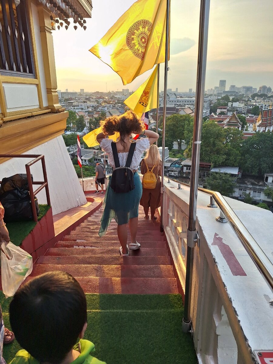 В выходные мы гуляли по городу и набрели на храм Ват Сакет. Решили заглянуть, хотя изначально не собирались, собственно поэтому я и надела неподходящие для посещения таких мест вещи - короткую юбку и топ.