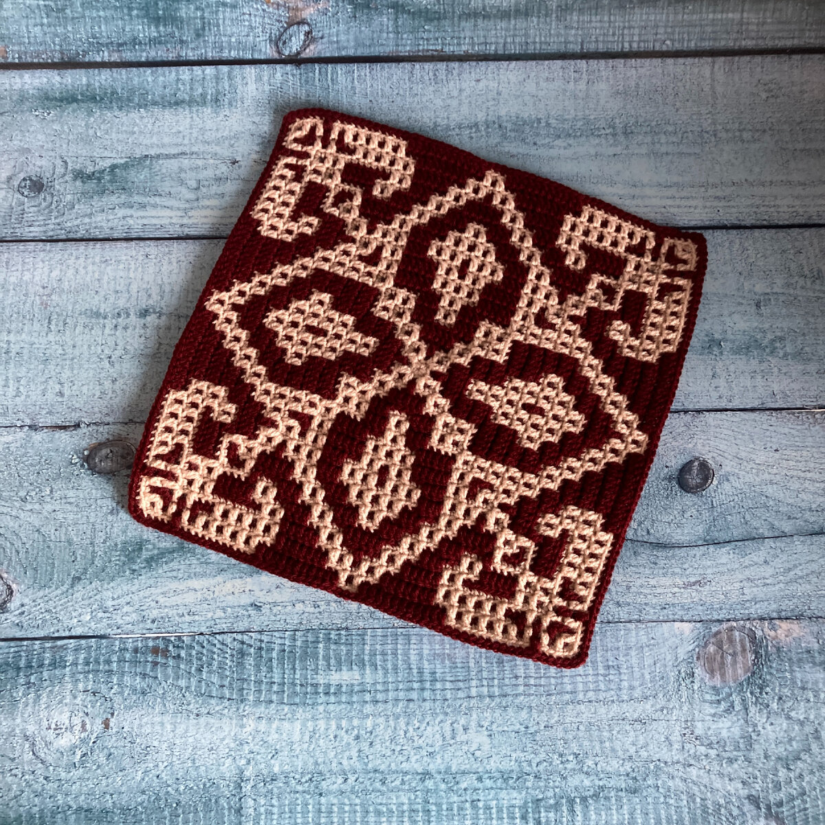 Связала новый квадратный мотив, сочетая одновременно две техники мозаичного вязания: "вафельную" и "гобеленовую". В "вафельной" технике вязала узор мотива, а в "гобеленовой" - фон мотива.