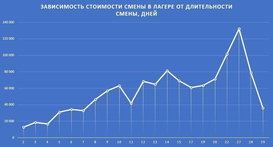 Можно заметить линейный тренд, прерываемый лишь некоторыми скачками, которые можно объяснить наличием в определенных сегментах длительности тематических лагерей с узкопрофильной программой, таких как компьютерные, творческие или роботоинженерные лагеря. Такие смены, как правило, стоят меньше, чем лагеря с разнообразными активностями.