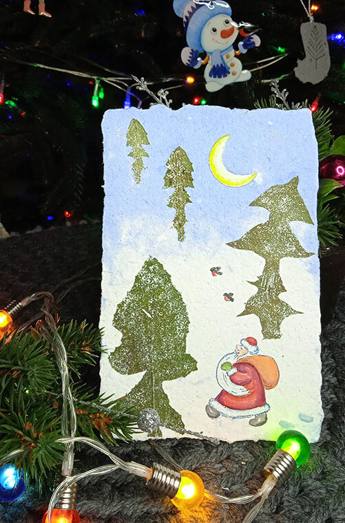 Идея этих открыток родилась еще летом. Пропалывая грядки в огороде и рьяно борясь с засилием одуванчиков, я вдруг поняла, что листья этого дачного сорняка еще могут послужить зимой отличную службу, ведь они немного похожи на ёлку, нарисованную детской рукой. Так, насушила я гербария из листьев одуванчика и других травинок и цветов, отлила бело-голубую бумагу, а муж нарисовал эти примитивные, но очень милые новогодние сюжеты. И вот уже второй год у нас рождается серия добрых новогодних открыток, к которым так и просится придумать маленькие детские сказки. А что, быть может, и родится из этого какой-то интересный проект. Пока же показываю эти открытки... Открытки с листьями одуванчика, которые нарисованы в этом году... А эта открытка мне сказу Павла Бажова "Серебряное копытце" напоминает. Правда, здесь солнце нарисовано, а не месяц ночной, но все равно какие-то ассоциации со сказкой Бажова вдруг возникли: "Ночь месячная, светлая, далеко видно. Глядит Дарёнка — кошка близко на покосном