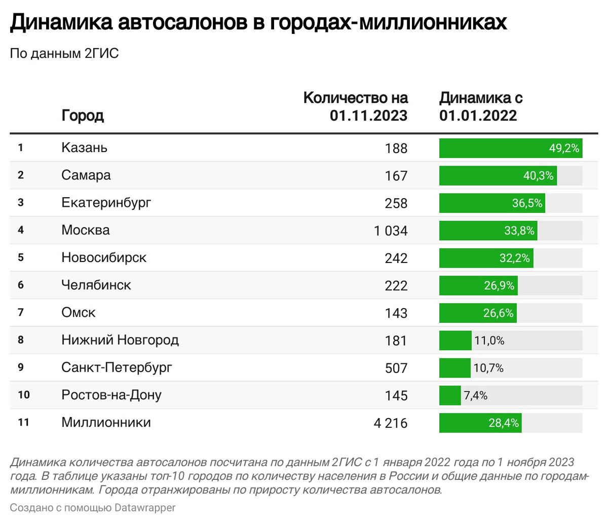 В России в городах-миллионниках, несмотря на уход многих западных автомобильных брендов, почти за два года открылось 1 тыс. новых автосалонов, выяснил Autonews.ru. По данным картографического сервиса 2ГИС (данные есть в распоряжении редакции), на ноябрь 2023 их общее количество составляет более 4 тыс. «В ноябре 2023 года в городах-миллионниках работает 4 215 автосалонов. В январе 2022 года в 16 городах-миллионниках, по данным 2ГИС, работало 3 283 автосалона. К началу ноября 2023 года количество автосалонов в миллионниках увеличилось на 28%», — сообщили в компании. В каких городах появилось больше всего новых автосалонов? Лидером по приросту стала Казань, в которой возросло количество автосалонов на 49,2% — сейчас их в городе 188. Следом идут Самара (40,3% — 167) и Екатеринбург (36,5% — 258). Москва в этом рейтинге заняла четвертую позицию — здесь с января салонов стало больше 33,8% — теперь их 1034. Из-за чего произошло резкое увеличение автосалонов? Опрошенные редакцией эксперты свя