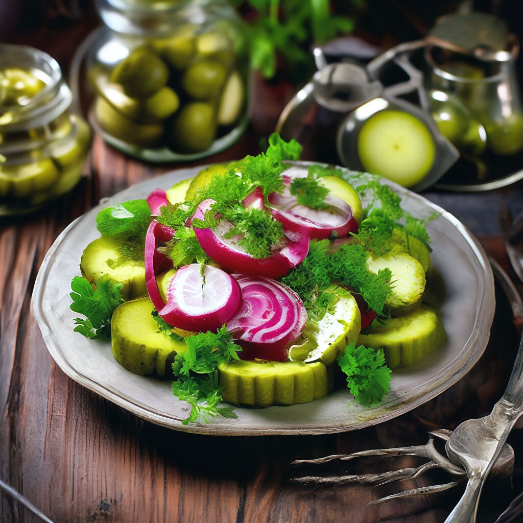Ингредиенты - 2 средних свежих огурца - 200 г солёных огурцов - 2 помидора - 1 красный лук - 150 г фета-сыра - 1/4 чашки оливкового масла - 2 ст. ложки уксуса - Соль и перец по вкусу - Свежие зелёные травы (укроп, петрушка) Инструкции 1. Нарежьте свежие огурцы, солёные огурцы, помидоры и красный лук кубиками. Переложите все ингредиенты в большую миску. 2. Добавьте кубики фета-сыра в салат. 3. В миске смешайте оливковое масло, уксус, соль и перец. Это будет заправка для салата. 4. Полейте салат приготовленной заправкой и аккуратно перемешайте, чтобы ингредиенты равномерно покрылись соусом. 5. Посыпьте свежими зелёными травами. 6. Дайте салату настояться в холодильнике несколько минут перед подачей. 7. Подавайте салат с солёными огурцами к гарниру или как самостоятельное блюдо. Приятного аппетита!