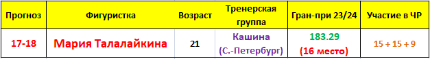 Для многих болельщиков Маша Талалайкина фигуристка словно бы из другого времени, которая в прошедшей серии Гран-при в 21 год была самой возрастной участницей женской дисциплины. Тем почетнее тот факт, что она смогла отобраться на свой 4й в карьере чемпионат России, причем спустя долгих 3 года с момента участия в своем последнем главном российском старте. Историю Маши ("В Италию и обратно") я уже неоднократно рассказывал, могу лишь еще раз выразить ей свое уважение и пожелать удачи в Челябинске, где она вряд ли займет высокое место, но это сейчас не самое главное.