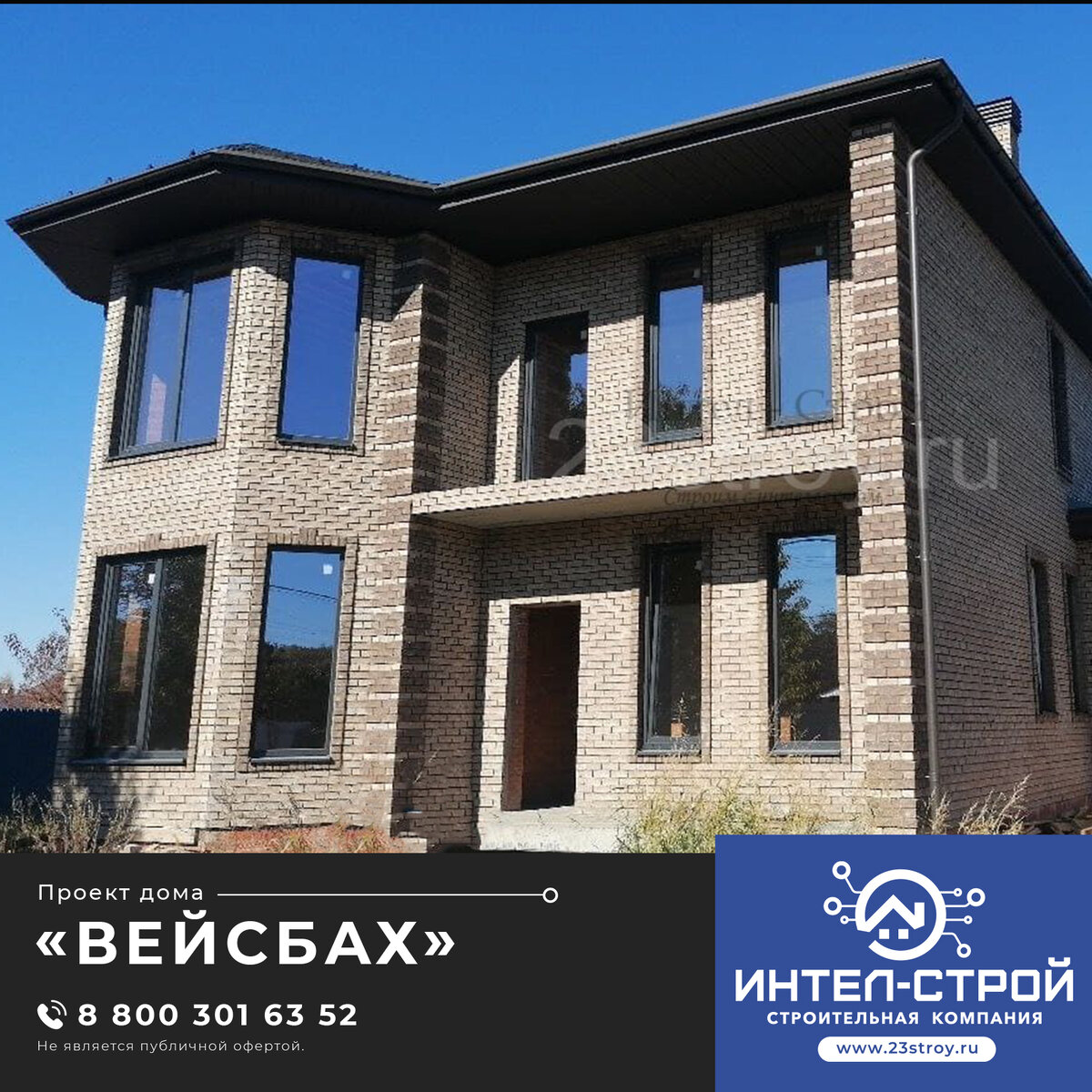 В отделке использован кирпич ручной формовки сложного серо-коричневого оттенка и декоративных элементов в виде рустов и кованых ограждений на главном крыльце, балконе и террасе. Цоколь дома облицован красивым натуральным камнем. Коротко о доме:
