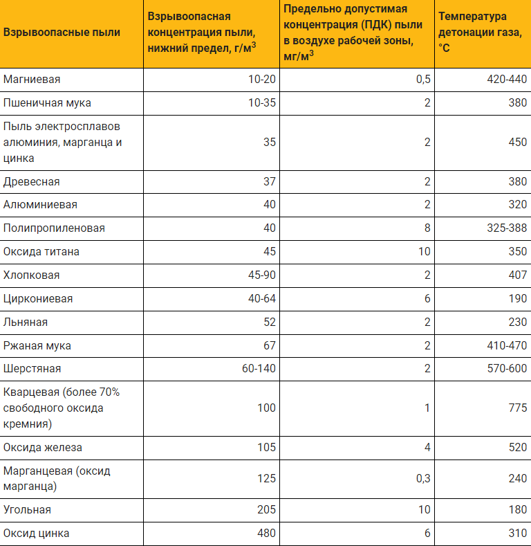 Как видно из таблицы, объем пыли может быть довольно небольшим, но это не снижает вероятности аварии. При этом существует и высший предел — от 1000 г/м3: концентрация здесь настолько высока, что для взрыва не хватает кислорода. Но это не исключает горения.