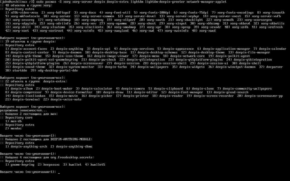 sudo pacman -S xorg xorg-server deepin deepin-extra deepin-launchpad lightdm lightdm-deepin-greeter network-manager-applet