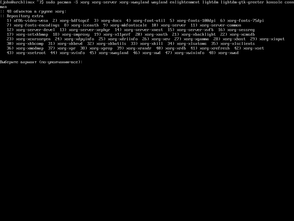 sudo pacman -S xorg xorg-server xorg-xwayland wayland enlightenment lightdm lightdm-gtk-greeter konsole connman
