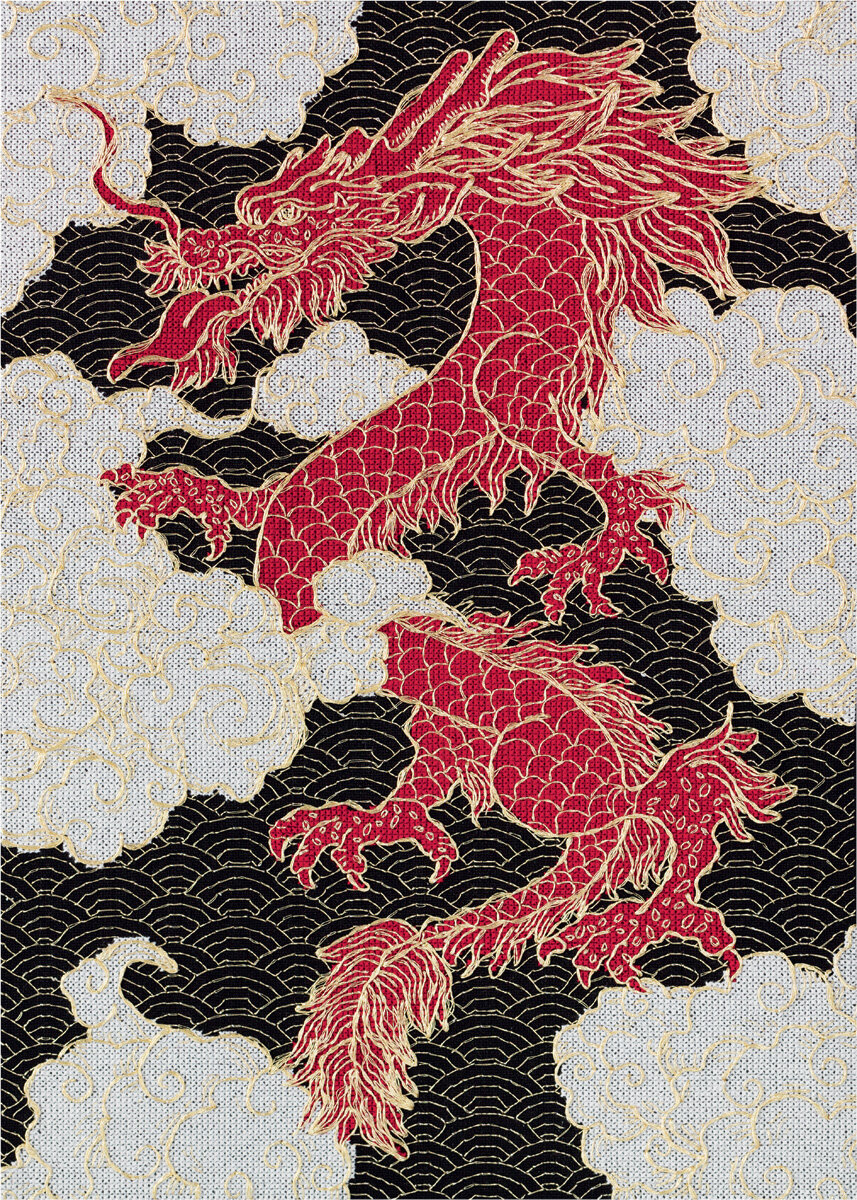 - Набор «Китайский дракон» – произведение искусства! Ключевая особенность здесь в металлизированной нити под золото, которая будет создавать эффект тонко прорисованного рисунка.