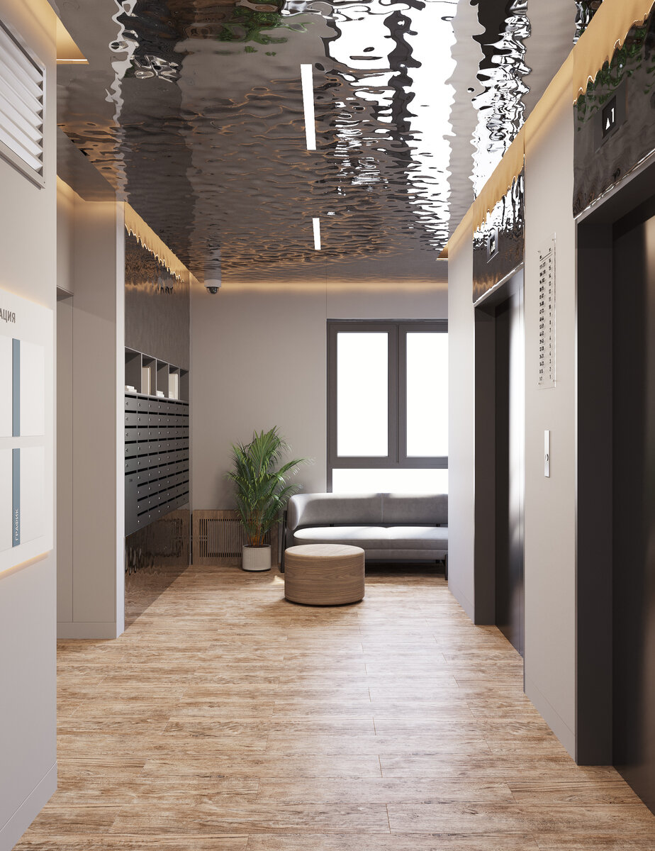 Хай-тек, минимализм и экостиль — в дизайне холлов Прибрежный парк соединились несколько направлений. На стенах и потолке имитация динамичных северных рек, в оформлении и на фурнитуре хромированные элементы, предметы интерьера в природных тёплых оттенках, много света и зелени. Благодаря такому сочетанию, получилась идеальная комбинация современного комфорта с природными мотивами и эстетикой.