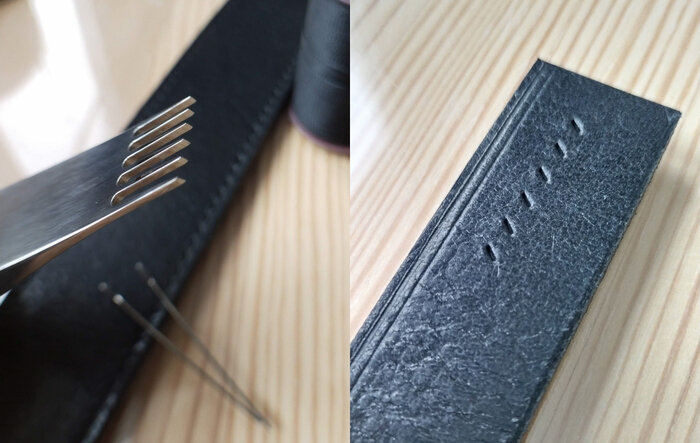 В процессе работы над одним из ремней очень захотелось немного рассказать про обработку уреза (края). Для тех, кто работает с кожей, все очевидно. Для несведущих, как показал опыт, интересно. Это довольно долгий, но не особо сложный ритуал. Просто вам всегда кажется, что можно сделать лучше, из-за чего дело затягивается. Ниже описан мой путь. Кто-то выбирает другие инструменты, пропускает/добавляет шаги. Все индивидуально и нарабатывается со временем. Речь в большей степени именно про ремень, но и других изделий тоже касается. Кожа растительного дубления. 0. Если ремень с прошивкой (как у нашей сегодняшней модели), то сперва делаем именно ее, так как для разметки шва урез должен быть максимально ровным. Размечаем кронциркулем линию, пробиваем отверстия, прошиваем. Пробойники под шов бывают разных типов и оставляют, соответственно, разные отверстия. В данном случае это "французы" с шагом 4 мм. На фото пробойник и отверстия, которые он оставляет (на смотрите на разметочные линии - это пр
