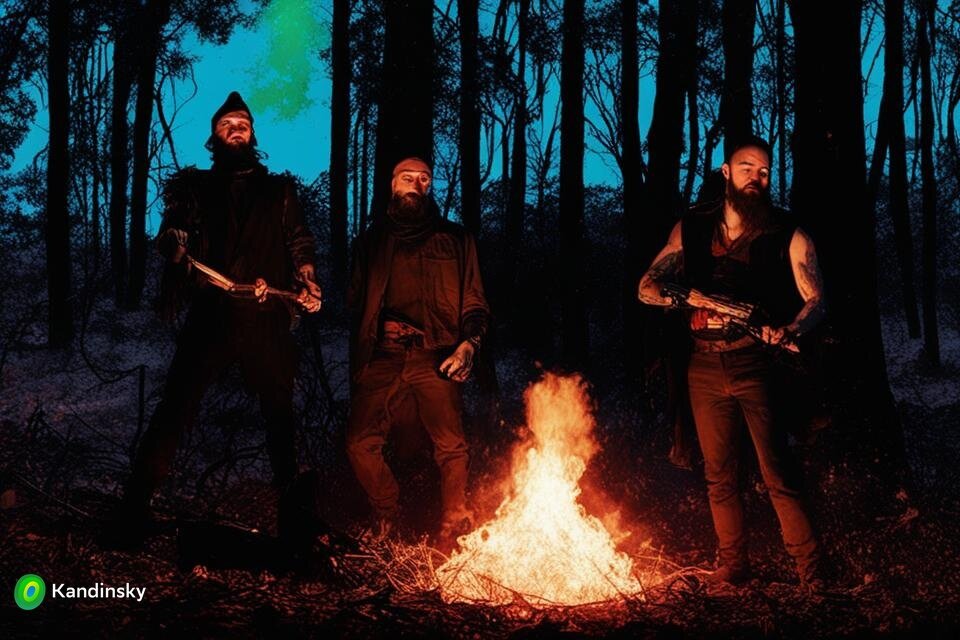 Вскоре Шапочка почувствовала аромат жареного мяса, услышала потрескивание костра и грубые мужские голоса. Девочка насторожилась. Продвигалась вперёд со всей осторожностью. Что там за люди? Надо бы сначала их рассмотреть, а потом уже думать, показываться перед ними или нет.