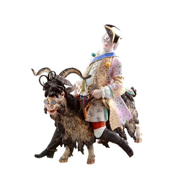 Фарфор; надглазурная роспись. Модель группы была создана скульптором Иоахимом Кендлером по заказу графа Генриха фон Брюля (1700-1763) – главного министра короля польского Августа III (1696-1763). Брюль чрезвычайно ценил своего портного, создавшего ему славу «лучше всех одетого человека». Портной пожелал поужинать с королем. Граф не посмел обратиться с такой просьбой к монарху, но заказал Кендлеру фарфоровую скульптуру своего протеже, где тот был изображен в комически-торжественном виде с инструментами своего ремесла. Скульптура была поставлена на королевском столе, что позволило портному «присутствовать» на ужине у короля. В дальнейшем скульптурная группа неоднократно повторялась на Мейсенской фарфоровой мануфактуре. Мейсенская мануфактура – первое предприятие по изготовлению фарфора в Европе – была основана саксонским курфюрстом Фридрихом Августом Сильным (1670-1733) в 1710 г. в замке Альбрехтсбург близ города Мейсена. До этого в Ев