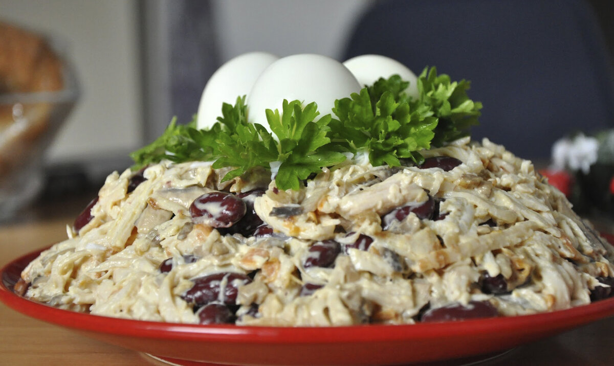 От 2023 года остаётся всё меньше и меньше дней...скоро год завершится и будет праздник - Новый год. Многие уже закупают продукты, консервы - горошек, кукурузу, фасоль, шпроты, икру... Чтобы 30-31 числа у себя дома готовить салаты, различные вкусные блюда, проводить за накрытым столом старый год и встретить новый... Такая традиция у многих людей повторяется из года в год. Моя семья тому не исключение. С детства помню, как мама начинала с середины декабря закупать продукты, уже планируя и составляя меню, что именно приготовит. Традиционно, новогодним салатом считается Оливье. Рецепты разные. Мы чаще готовим салат "Оливье" с отварной курицей. Моя мама, уже лет как 20, делает грибной салат к Новому году: - отварная красная и белая фасоль (подойдёт консервированная из банки в собственном соку), варёные яйца, жареные шампиньоны с луком, майонез. Салат делается просто и он вкусный! Особенно его оценят любители грибов )) Я грибы люблю в любом виде, и солёные, и маринованные