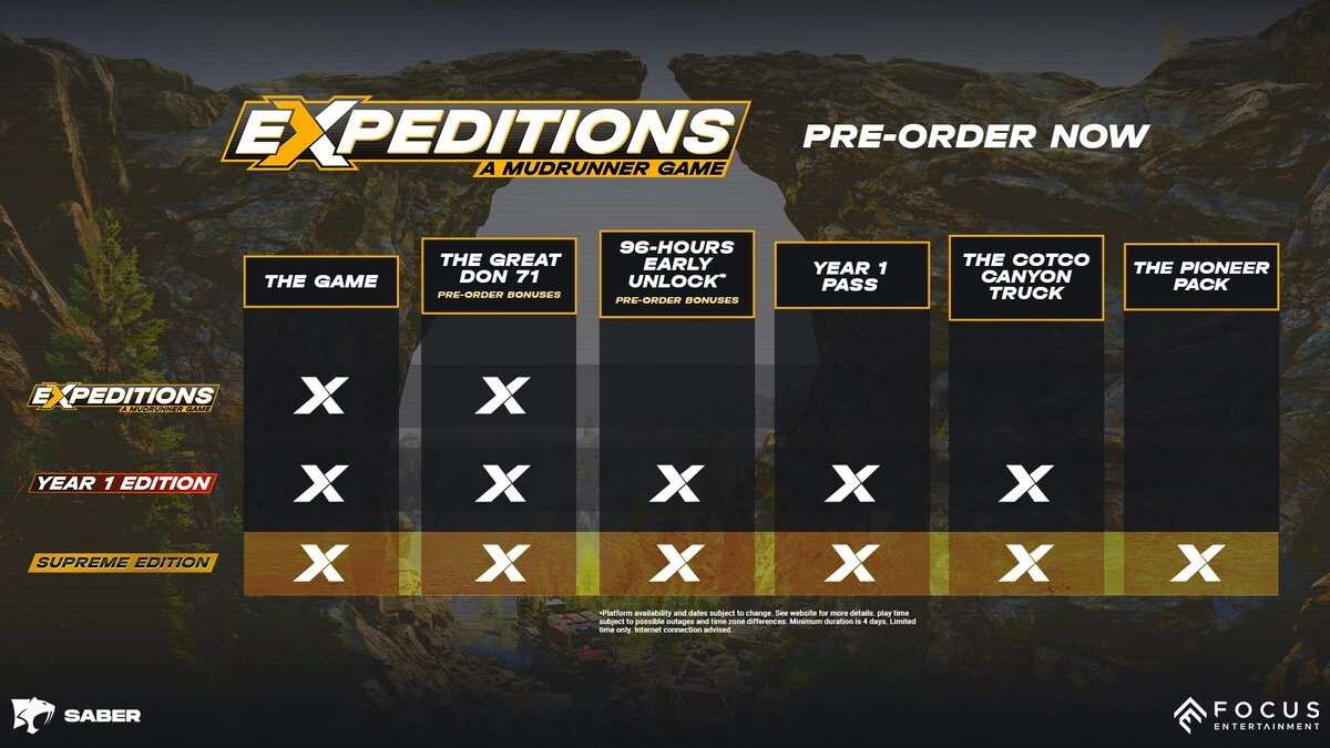 Студия Saber Interactive и издатель Focus Entertainment сообщили дату релиза симулятора езды по бездорожью Expeditions: A MudRunner Game. Игра выйдет на полках виртуальных магазинов уже 5 марта следующего года и будет доступна на ПК, консолях текущего и прошлого поколений, а также на Switch. Кроме того, стартовали продажи наборов предзаказа. Всего доступно три издания — базовая версия, версия первого года и верховная (Supreme) версия. За первое вы получите игру и облик The Great Don 71, за второе добавляется пикап Cotco Canyon, а также контент, который выйдет в течение первого года с момента релиза, а за самое дорогое издание вам выдадут дополнительно четыре бонусные версии для автомобилей. Стоимость предзаказов 2199, 3299 и 3799 рублей соответственно. https://youtu.be/N_5Dj3dSJlQ