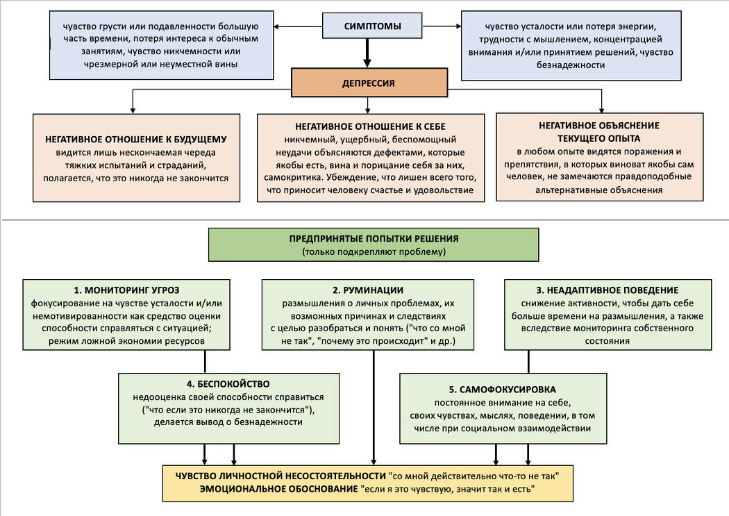 Основные механизмы поддержания депрессии, являющиеся мишенями терапии: 1. Руминации. Трудно контролируемые повторяющиеся мысли о личных проблемах или симптомах депрессии, о возможных причинах и следствиях. Постоянные размышления с целью понять причины печали и выработать способы справиться с тревожными мыслями и чувствами, а также поиск ответов на вопросы: почему я так себя чувствую; что это говорит обо мне; как я могу почувствовать себя лучше и др. Руминация направлена на установление понимания и смысла. Цель: избегание негативных переживаний. Руминации поддерживаются позитивными метаубеждениями об их пользе (например: размышления помогут мне разобраться: понять, что со мной не так и найти причину) и негативными метаубеждениями об их неконтролируемости (например: я не могу контролировать свои мысли и настроение). Работа с руминациями предполагает работу с метаубеждениями. 2. Мониторинг угроз. Неполезные стратегии внимания при депрессии часто включают в себя фокусирование на симптомах