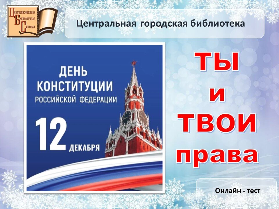 12 декабря в стране празднуется День Конституции РФ, в честь этого Центральная городская библиотека приглашает принять участие в правовом онлайн – тесте «Ты и твои права»