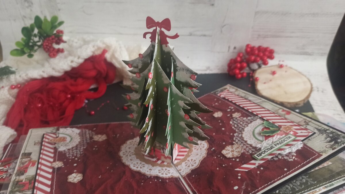 Всем привет. Сегодня рассмотрим конструкцию поп-ап елочка, которая подойдет для зимнего альбома. Приготовим шесть деталей из зеленого кардстока разных оттенков Вот сама схема, по которой вырезаем мы елочки Чтобы сделать елочку заснеженной, надо нанести белый грунт. На одной из маленькой елочки надо приклеить дополнительные клапаны, чтобы потом склеить елочки между собой. Берем маленькие детали с клапанами и сгибаем их, продеваем пазы, как показано на видео. Складываем елочку, как показано на видео и наносим клей на клапаны. Елочку стараемся располагать примерно посередине. Закрываем разворот и приклеиваем. Далее вставляем в пазы наши большие детали Пазы не должны быть слишком широкие, чтобы детали не вываливались. Складываем и проверяем, чтобы наши ветки не выступали за края страницы.