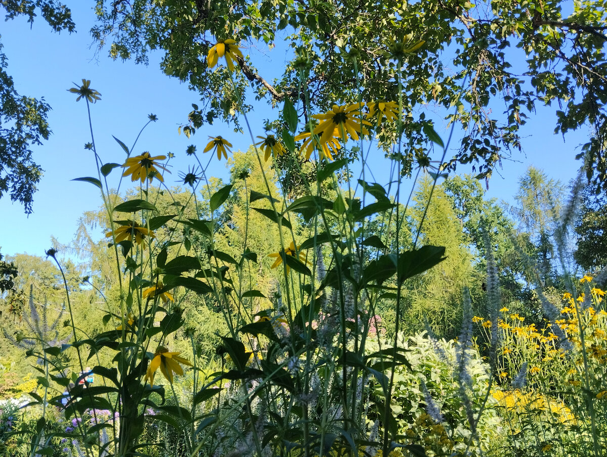 Минувшим летом я исполнила свою давнюю мечту и посетила Ботанический сад Петра Великого. Поскольку к началу августа в иридарии делать уже было нечего, я особенно стремилась в зону горок, справедливо рассчитывая застать цветение растений Америки, Альп, Кавказа и др. природных зон. Не буду утомлять вас историей Альпийских горок ботанического сада, об этом много и подробно написано на сайте ботсада. Я сделала сотни фотографий и не меньше заметок в своем блокноте. Можно написать не один десяток статей, вдохновится большим количеством идей. Но сегодня я покажу лишь несколько фото с наиболее понравившимися мне сочетаниями растений, повторить которые можно и в наших садах. Рудбекии, вероники и вероникаструмы. Рудбекии рассеченные очень хороши! Солидаго, полынь и посконник. Астры и анафалис. Золотарник и анафалис. Анафалис меня впервые впечатлил настолько, что захотелось внести его в свой сад. Очень интересное сочетание здесь с разными видами золотарника. Будем сеять! Золотарник - отличный фо
