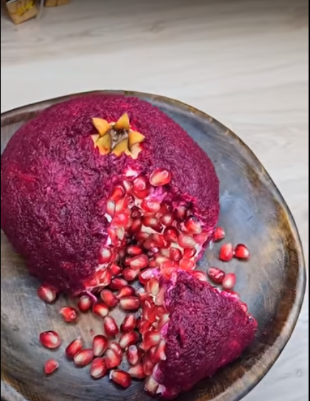 Традиционно на Новый год мы готовим праздничные салаты. И каждый год хочется чего то оригинального и неизбитого. Сегодня предлагаю приготовить салат «Гранат» с черносливом и орехами, а также с куриным филе. Простые и доступные ингредиенты, но очень необычная и красивая подача. Нам понадобится: 1 вареное куриное филе 100гр. чернослива 100гр. твердого сыра 50 гр. грецких орехов(можно немного поджарить на сковороде) 2-3 зубчика чеснока майонез, перец, соль, зелень по вкусу 1 гранат 2 средние свеклы Все составляющие салата нарезаем кусочками какими вам нравится, сыр натираем на терке, все заправляем майонезом и специями. Далее салату придаем форму большого ГРАНАТА. Сверху кладем срезанный с граната хвостик, для реалистичности :). Весь салат покрываем натертой на мелкой терке свеклой. Теперь как на показано на фото, отрезаем кусочек , как на торте и срезанные края смазываем майонезом. И туда же на майонез крепим зерна граната. Салат готов! Не только красивый но и очень вкусный. Поверьте,