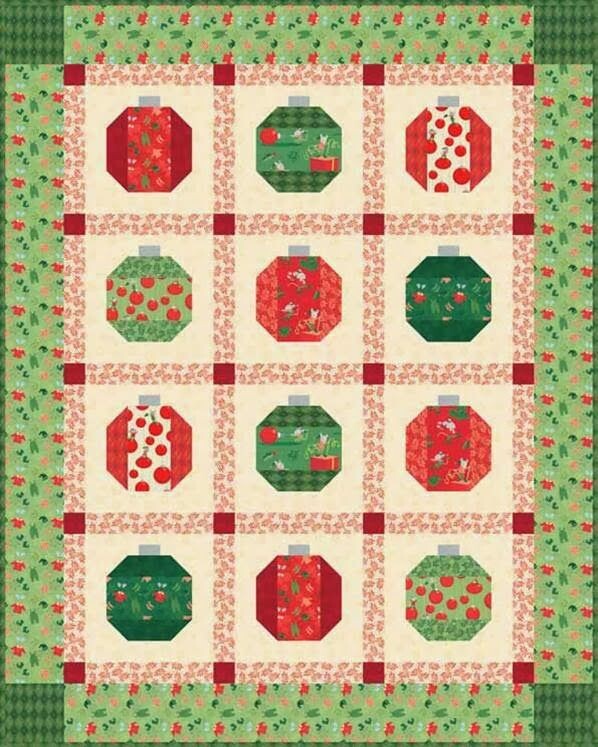 Дизайнер изделия Anita Peluso Готовый размер 55" x 69" Компания www.clothworks.com info@clothworks.com Потребуется: Размеры даны на основании ширины ткани 42” 1/8 ярда - красной с рисунком (Y1205-4) 1/8 ярда – красной с листьями (Y1210-4) 1/8 ярда – темнозеленый со снежинками (Y1207-22) 1/8 ярда – лист оливы (Y1210-23) 1/4 ярда – красная снежинка (Y1207-4) 7/8 ярда – зеленый оливковый с рисунком (Y1205-24) 1 четвертинка (50 см х 55 см) – красной с рисунком (Y1206-4) 1 четвертинка – оливковой с рисунком подарки (Y1206-24) 1 четвертинка – бежевая (Y1209-2) 1 четвертинка – оливковой с орнаментом (Y1209-23) 1 четвертинка – красная в рисунком одежды (Y1208-4) 1 четвертинка – темно-зеленая с рисунком одежды (Y1208-22) 1/8 ярда – серой (Y1062-5) 1 1/2 ярда бежевая с рисунком (Y1207-2) 7/8 ярда - бежевая (Y1210-2) 1 1/8 ярда – оливковой с рисунком (Y1208-23) 3 1/2 ярда – для нижнего слоя Кратко: Всего 12 блоков: 6 красных и 6 зеленых. Для игрушек надо 6 разных красных и 6 разн