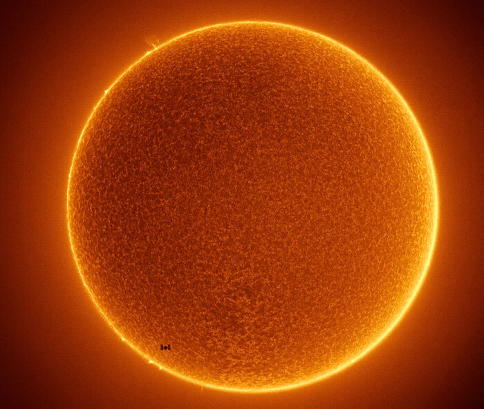 Если приглядеться, то МКС (Международную космическую станцию), видно в нижнем левом углу солнечного диска. Данный снимок был сделан фотографом фотографом Рейни Колакурсио благодаря специальному водородно-Альфа-солнечному прицелу. Этот прицел помогает увидеть Солнце в его настоящем огненном состоянии, в котором он и находится уже на протяжении миллиардов лет. В кадре видна и МКС, которая в этот момент проходила между Землей и Солнцем. Поэтому, оно так хорошо запечатлено на диске нашей звезды. Правда, нужно сказать, что тут совмещены две фотографии, которые были сняты одновременно. Первая фотография сделана с самой космической станцией в момент ее прохождения через Солнце, и вторая - фотография, непосредственно, поверхности Солнца.