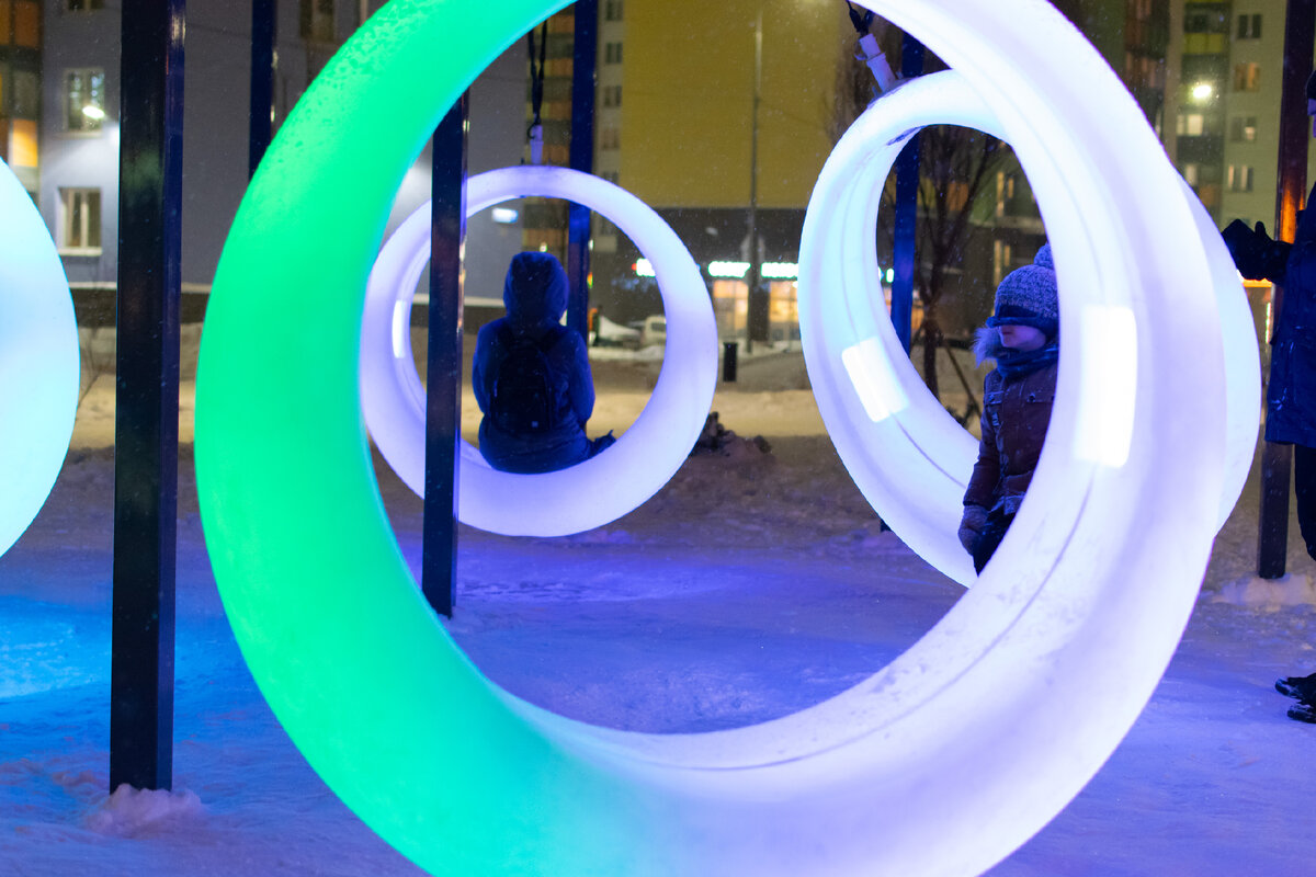 Светящиеся разными цветами качели, танцующий дом, новогодние украшения, да еще все это на фоне пушистого снега - сейчас в городе Мурино, в котором я живу, много всего красивого (кстати, несколько лет назад он еще считался поселком). А так как я практически никогда не снимала по вечерам, решила это исправить и поделать фотографии в темное время суток. Мой любимый дом с необычным архитектурным решением всегда смотрится эффектно, хотя у меня и возникает постоянно вопрос - а насколько удобно там жить и делать ремонт? Как думаете? Это ведь не обман зрения, внутри там планировки тоже довольно оригинальные (не у всех квартир, но у некоторых точно). Еще там обещают яблоневый сад во дворе и арт-объекты на территории, любопытно будет посмотреть, когда все достроят. Этот дом совсем рядом с нашим. Новогодние украшения тоже появились, но пока не везде, ждем еще елочку в нашем дворе. Эти чудесные качели всегда привлекают внимание, на них нравится качаться и детям, и взрослым. Я тоже с удовольстви