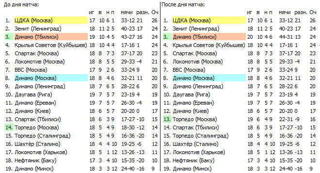 Примечание. Участие в матче Элошвили, Панюкова, Джоджуа и Вардимиади не подтверждено. КРУПНЫЙ УСПЕХ ТОРПЕДОВЦЕВ Вчерашним матчем на московском стадионе «Динамо» торпедовцы столицы вступили во второй круг розыгрыша первенства страны. После серии неудач в первом круге обладатели Кубка СССР, выступая против сильного коллектива динамовцев Тбилиси, показали, наконец, присущие им высокие боевые качества