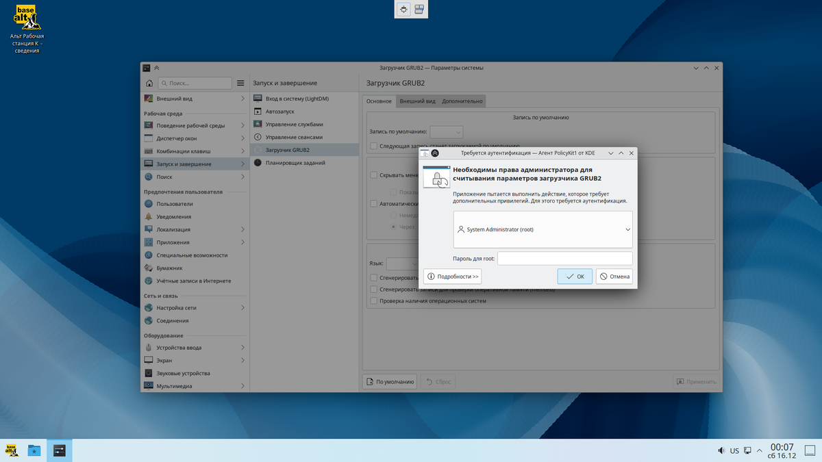 АЛЬТ линукс Рабочая станция K и другие варианты дистрибутива с KDE - работа с настройками загрузчика GRUB через параметры системы