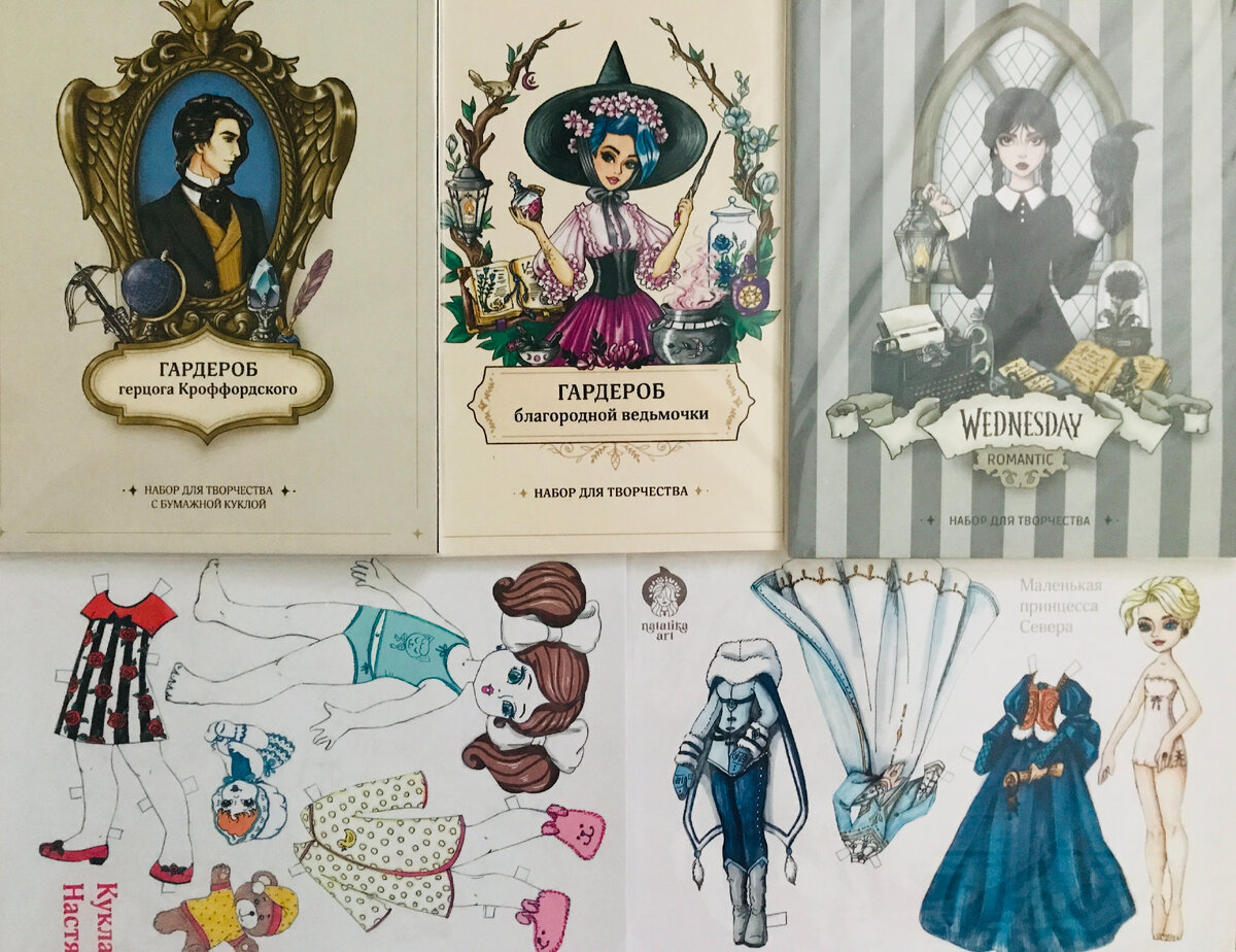 Дорогие читатели, многие из вас наверняка знакомы с творчеством художника Наталии Калашниковой. Я её куколок очень люблю, и вроде собрала всех нарисованных и опубликованных на сегодняшний день. Некоторых её куколок -- Флоренс, Уэнздей и Герцога показывала Наталья из блога "Бумажные куклы". Чтобы не повторяться, я решила показать Принцессу Севера, которую Наталия подарила подписчикам своей группы. Флоренс, Уэнздей и Герцога я уже несколько раз порывалась вырезать, но наборы так хороши, что каждый раз я залипаю на их разглядывании. Сижу, перебираю страницы -- гладкие, прекрасные, приятного цвета, красиво оформленные, разглядываю куколок, их локации, наряды. И откладываю, думаю -- ну как такую красоту кромсать, пусть это фон, страницы, но такие замечательные, что жалко. Наталия Калашникова это редкое сочетание таланта и трудолюбия. Она не просто рисует красивых куколок, она ещё и проверяет их "в деле" -- удобно ли вырезать, как сидят на куклах наряды. Поэтому и получаются каждый раз такие