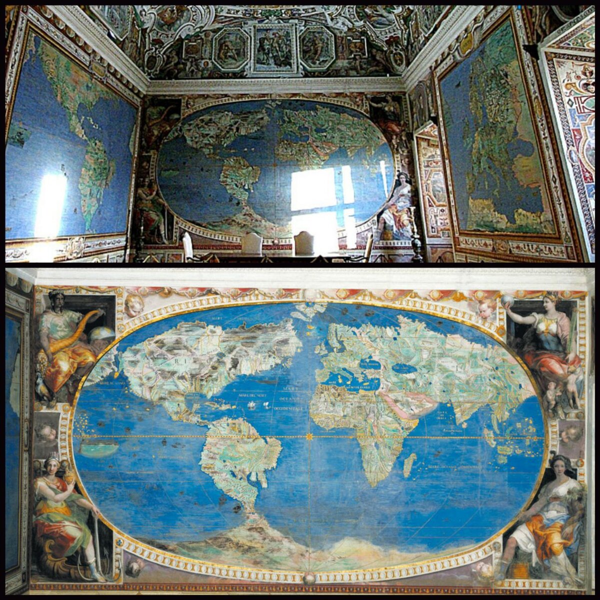 Дворец Палаццо Фарнезе в Риме был построен примерно в 1530г. Одним из украшений в расписных залах, кроме великолепных фресок, стала подробная карта мира. Карта выполнена невероятно подробно, с руслами рек, городами, портами и достопримечательностями. От привычной нам она отличается Зелёной Антарктидой. На карте все видят? Ну как, Антарктидой.. Огромным единым материком, состоящим из двух Америк, где Южная Америка соединена с цветущими землями Антарктиды. И никакого пролива Дрейка!