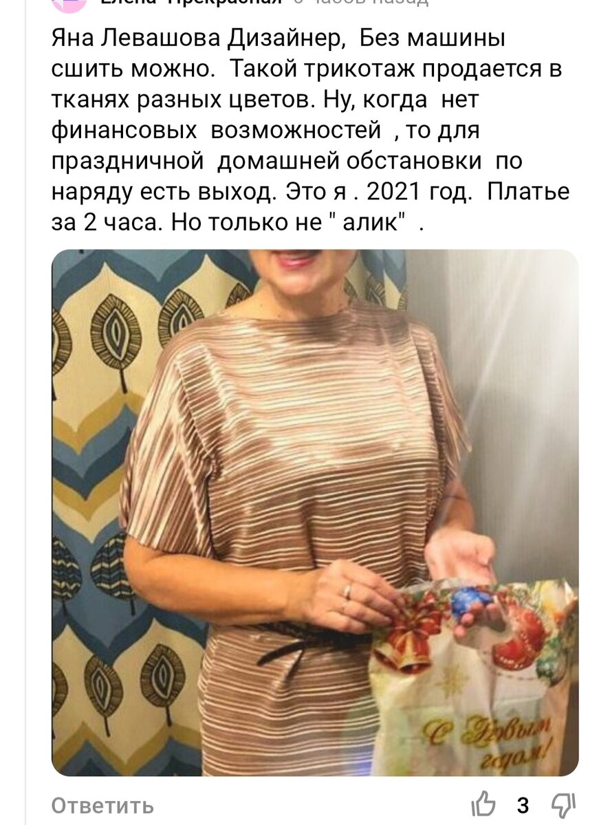 Или в ночь с 30 на 31 :) Думаю, каждому шьющему это знакомо. Кто-то старается максимально упростить задачу, мне писали об этом в комментариях. Дама шьет без оборудования вручную. Главное не покупать на Али. Народ в комментариях не оценил. Не поняли, где можно взять отрез ткани без брака за 100-200р. И сколько ее можно взять на эту сумму? Второе, как шить ручными стежками, когда у большинства на это нет времени и навыки только со школьной скамьи. Проложить 2 плечевых и 2 боковых на швейной машине можно гораздо быстрее и будет прочнее. Третье, по риторике комментатора получается, что такое платье "лучше алика" каждый год. Ведь швейной машины как не было, так и нет, а шить вручную более сложные фасоны явно нет желания. По обработке срезов понятно, синтетику можно зажигалкой обжечь аккуратно, главное, чтобы не драло потом кожу, не цеплялось за колготки. Мое "быстрое платье" Здесь подробно описан процесс. Многие новогодние платья для себя я со съемкой шила по 2-3 дня, иногда 30 или 31 дека