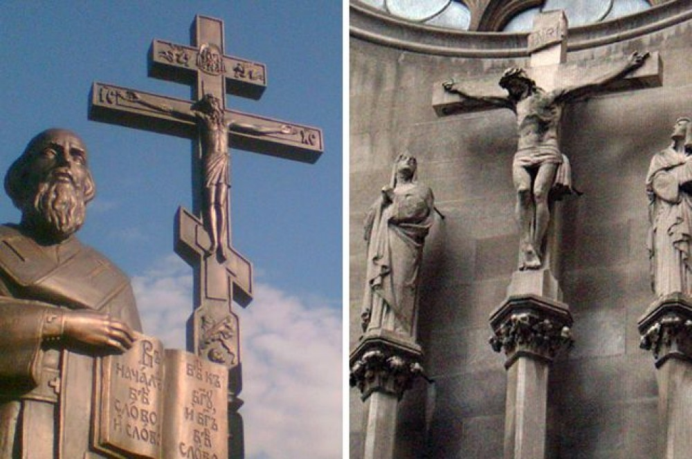 О непосредственном различии двух главных толков христианства я уже недавно подробно рассказывал. Теперь же на детали сосредоточусь - в частности, на различии наших Символов Веры - крестов. Сразу нужно пояснить, вообще католики и православные не считают кресты друг друга такими уж неправильными да неверными. Еще святой Федор Студит как говорил: неважно какой крест, лишь бы христианский был. То есть, крест он - Символ Веры для всех христиан. Неважно какой формы. Но все же, например, православные отцы говорят: лучше не искушаться и следовать именно своему кресту. В православной церкви католический крест при находке советуют "не выбрасывать, а отнести в ближайшую церковь". Там, мол, разберутся, что делать. Форма креста Итак, православный крест бывает чаще всего 6- и 8-конечным. То есть, православные стараются более строго следовать описанной в Евангелии форме креста, на которым был распят Иисус. Хотя встречается и так называемая византийская (греческая) форма, 4-х конечная. У католиков кре