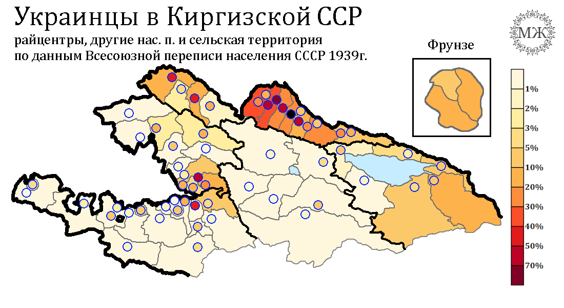 Украинцев на 1939 год было немногим меньше узбеков - 137 тысяч человек или 9%. Как и русские, они рассредоточены в основном на севере. Но как и русские, они жили также на юге и имели зафиксированные поселения со своим большинством. В данном случае это два райцентра - село Октябрьское Октябрьского района Джалал-Абадской области и село Ленинское Куршабского района Ошской области (ныне сёла Багыш и Куршаб). Сёла были основаны переселенцами из Украины ещё в 19 веке.