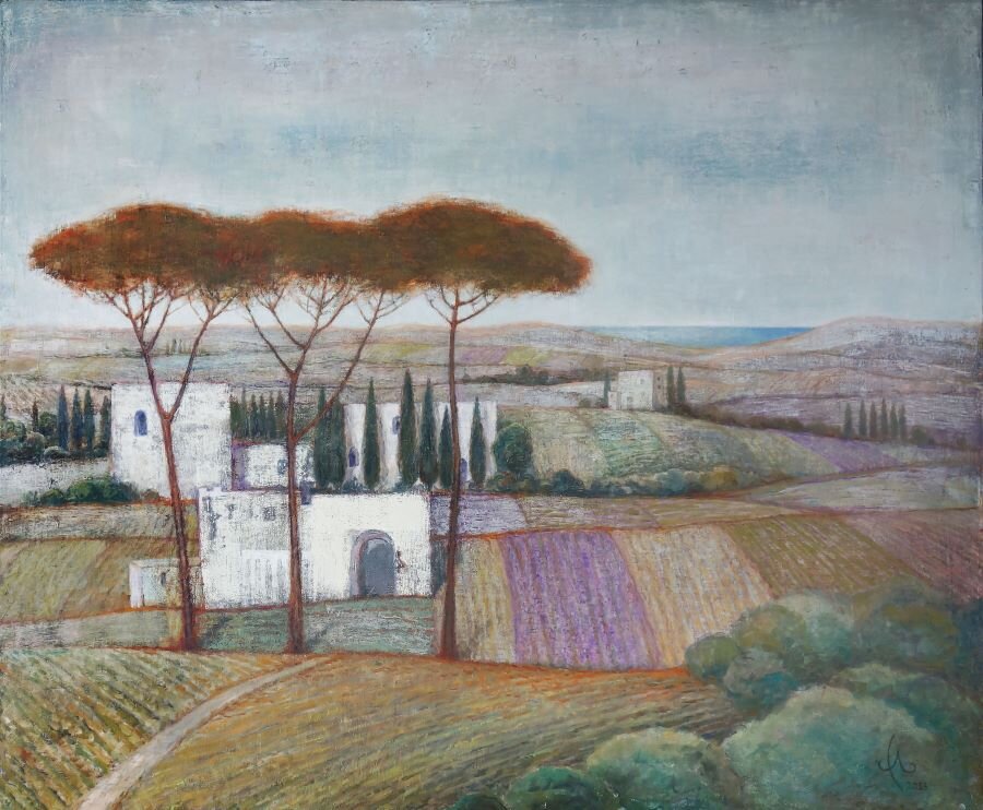 Работа художницы Спикторенко Лилианы «Вне времени» - наглядный пример современного сельского пейзажа. Картина сочетает в себе классическую тему природы и новый подход к ее исполнению. Изображение Прованса с лавандовыми полями и кипарисами похоже на пейзажи французских мастеров живописи XVIII века, при этом манера написания, мозаичное накладывание цвета, использование линий и пунктиров говорит о том, что перед нами работа современного художника.