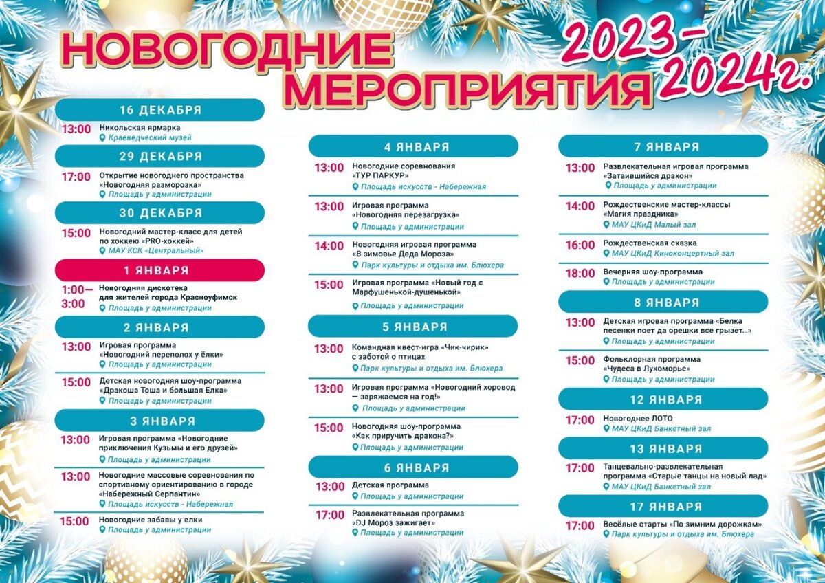 Совсем скоро наступит Новый год, который люди любят не только за особую атмосферу, но и за каникулы и длительные выходные. Рассказываем вам, куда можно сходить в предпраздничные и праздничные дни. В программу могут быть внесены коррективы и дополнения. 26-28 декабря 16.00-18.00 — Приемная Деда Мороза (городская администрация, 3+); «Затаившийся дракон», новогодняя программа (микрорайоны города, 3+). 27 декабря 10.00 — Рождественский кубок по мини-футболу («Олимп», 6+); 19.00 — трансляция концерта из Свердловской филармонии (виртуальный зал Центральной библиотеки, 12+). Новогодние мастер-классы в Центральной библиотеке (6+). 29 декабря, 17.00 — открытие новогоднего пространства на площади у городской администрации (3+). 20-30 декабря — новогодние программы для детей и подростков (МУ «Космос», 5+ и 12+). 24-30 декабря новогодняя Barbie-вечеринка для учащихся 4-6 классов (ЦКиД, 6+); 11.00 и 13.00 — детская новогодняя шоу-программа «Дракоша Тоша и большая Елка» (ЦКиД, 4+). Первенство СПО ГО