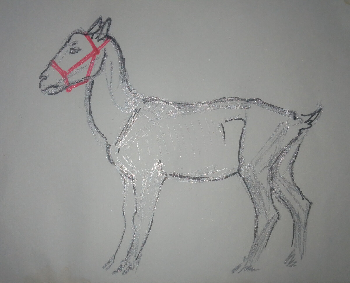 Сложное животное - коза. Вернее - козел. Не всегда, а при пошиве амуниции. Полностью скопировать амуницию неоткуда - козлиная анатомия слишком отличается от лошадиной, собачьей, и даже анатомии северного оленя, которому козел более близкий родственник. С недоуздком для безрогого козла в принципе все понятно - это уменьшенная копия недоуздка для лошади: Хотя и тут есть особенность - длинный, широкий, плоский лоб лошади будто создан для всяческих украшалок, а у козла на этом месте бугры от рогов, так что прилеплять какую-нибудь красивость в центре налобника бессмысленно: Но корпус козла намного сложнее! Он состоит из нескольких костлявых частей и большой, постоянно меняющей свою геометрию пузямбы. Самая костлявая часть - это холка: выпирающий между лопатками гребень выростов в верхней части позвонков. У быков и крупных оленей очень высокая обмускуленная холка, на которой, как на вантах, подвешена на сухожилиях тяжелая шея с массивной рогатой головой. Поэтому именно на шею перед холкой ок