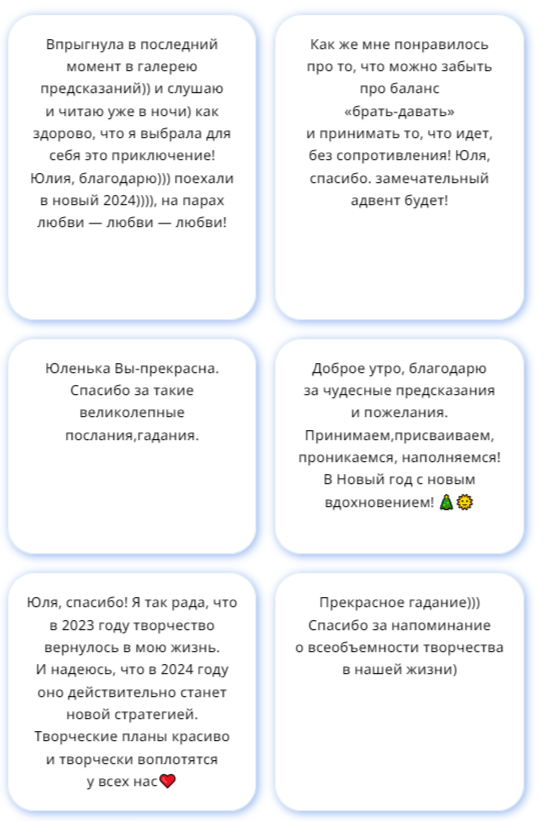 Галерея предновогодних стратегических предсказаний находится в самом разгаре. Каждый день участники делятся своими мыслями и чувствами о том, как эта галерея помогает им. И это так здорово! Мы создали нечто по-настоящему уникальное - галерею, которая не только помогает планировать будущее, но и приносит радость и вдохновение.