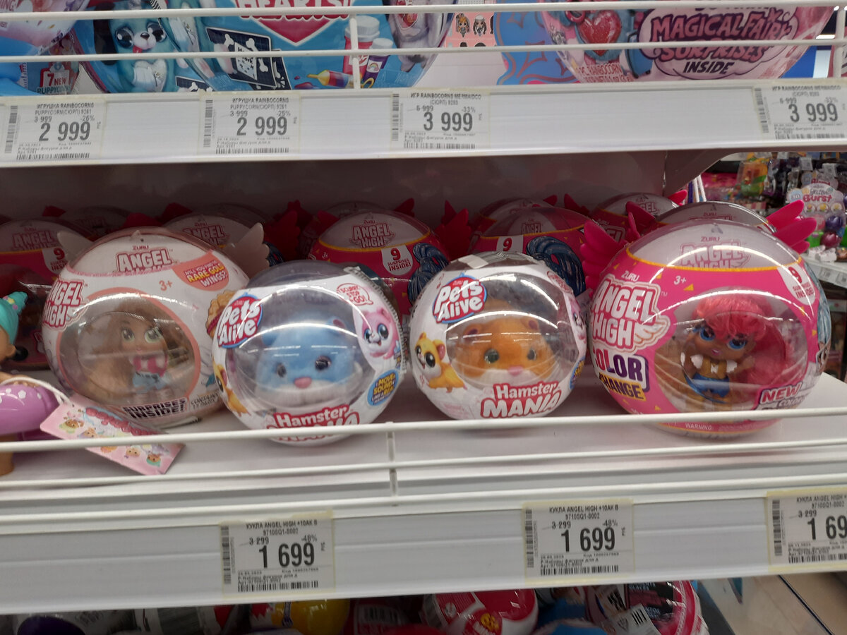 Понятно, Детский мир уже поднадоел, набил оскомину опытным кукольникам, а мне, в преддверии нового 2024-го, пришлось прийти сюда волей судьбы, забрать дочкину юбку для вечеринки, ну и конечно прошлась по кукольным рядам 🙂 Давно я не обращала внимание на какие-то миниатюрные игрушки, в шариках выглядывают забавные мордочки животных, и куколок; Когда дочь была в детском саду, она часто просила приносить ей сюрприз, игрушку, и я покупала маленькие игрушки такого формата, surprizamals, например, даже не знаю, есть ли они сейчас, но там были маленькие классные зверьки, мы собирали целые коллекции. Но стоили они 300-400р/шт, не так дорого конечно .. Пупсы и куклы-дети вызывают у меня все больший интерес последнее время, нравится многообразие куколок Весна, особенно небольших, типа Эли, сразу возвращают в детство среди Барби я нового не увидела, но есть разные Экстры, они такие ровные, и красивые, что не могла поснимать и их, девочка-дракон с лаймовыми волосами у меня есть, а вот Джойс
